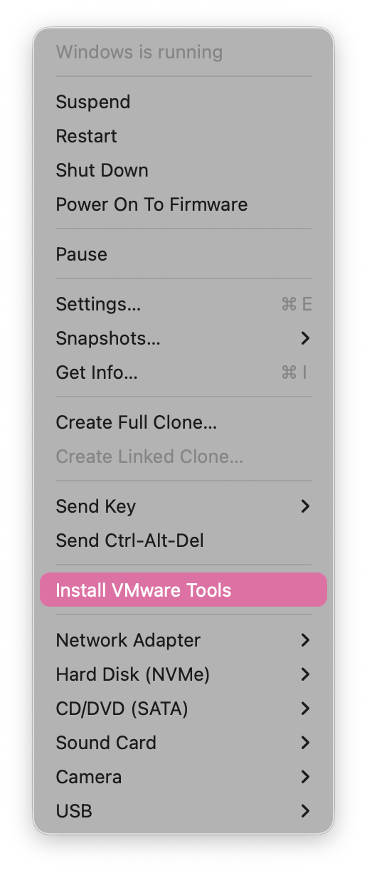 Virtual Machine→Install VMware Toolsin the menu bar of VMware Fusion.